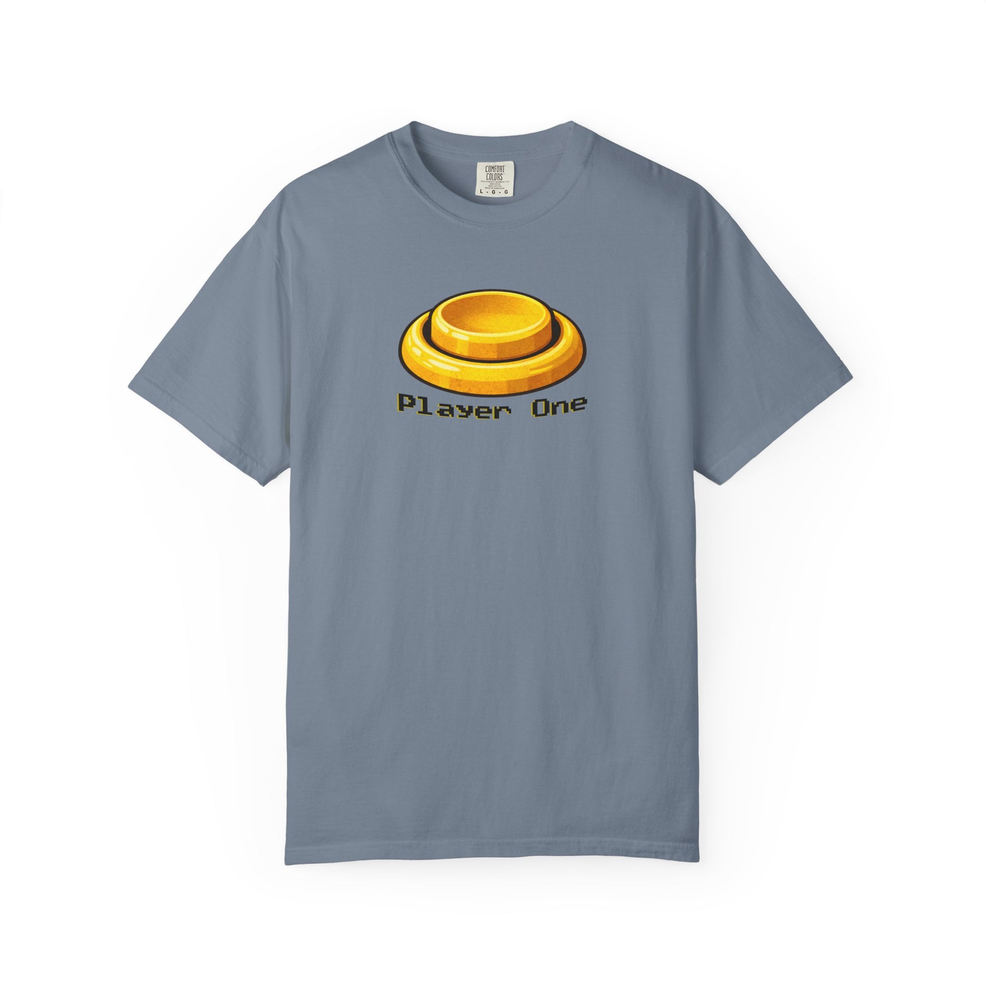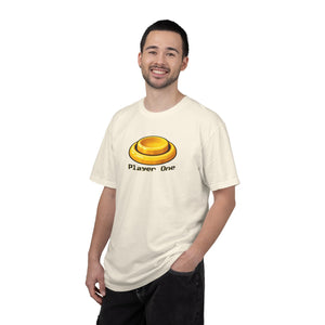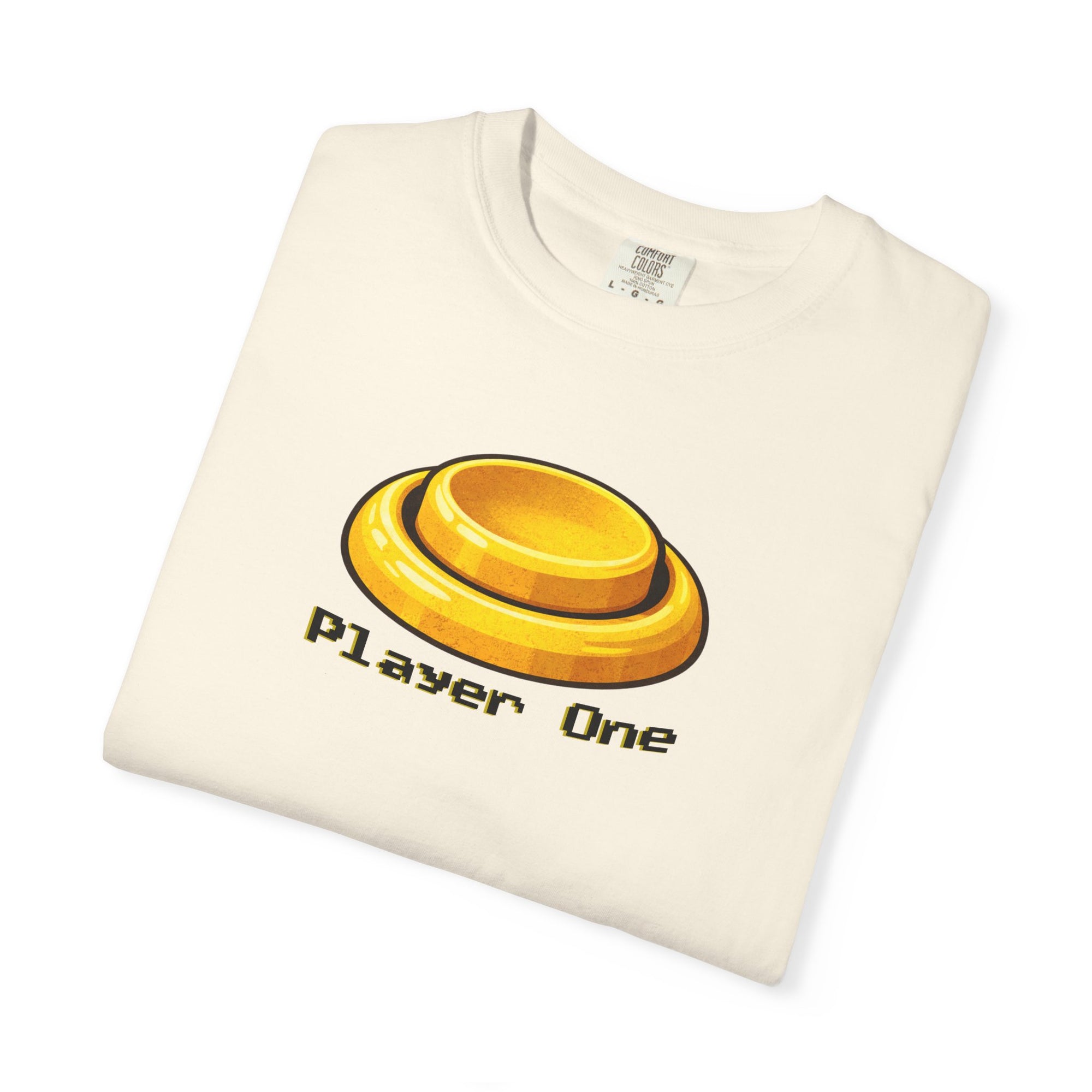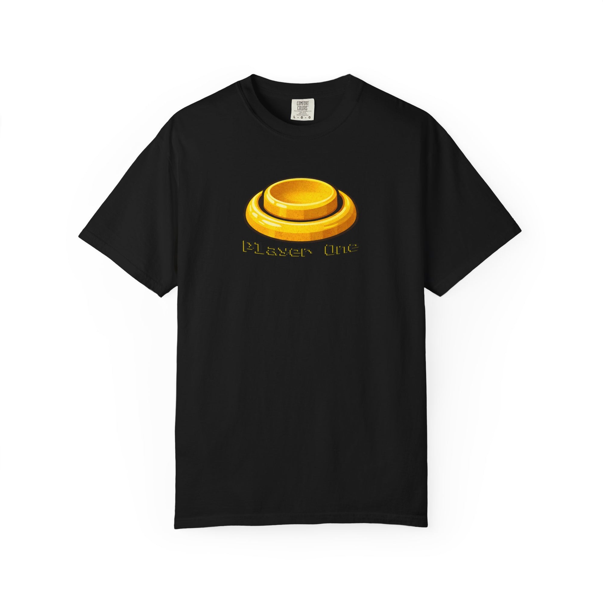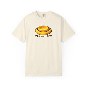 This tee pulls straight from dimly lit arcades, sticky buttons, and the quiet confidence of grabbing the first controller. A warm golden Player One button sits front and center in a pixel-friendly font—simple, familiar, and instantly understood by anyone who’s ever hovered over.